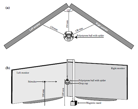 Per questo è stato testato un gruppo di Phidippus regius in un compito di segmentazione figura-sfondo. Abbiamo usato il metodo descritto da Humpfrey et. al. (2018). La tecnica permetteva di non arrecare danno al ragno che subito dopo il test poteva essere tranquillamente rimesso nel suo habitat. I ragni sono stati trattenuti in cima a una palla di stirene, abbastanza leggera da essere tenuta da loro. La palla, a sua volta, era in contatto con un sensore laser di un mouse, in grado di rilevare qualsiasi rotazione dell'oggetto stirene. Abbiamo proiettato stimoli in movimento, che potevano presentarsi a sinistra o a destra dell'animale. Se si verificava un rilevamento, il ragno avrebbe provato a girare verso l'oggetto, muovendo la palla di stirene trattenuta e dandoci la possibilità di rilevare un cambiamento. Gli stimoli erano composti da strisce bianche e nere parallele con 4 diversi orientamenti possibili (45°, 35°, 0°, -45°), presentate su uno sfondo composto dalla stessa linea sempre orientata a 45°. Mentre lo stimolo si muoveva, le strisce si muovevano alla stessa esatta velocità, ma nella direzione opposta, creando una velocità di movimento illusoria dipendente dalla differenza tra i due orientamenti (e rendendo lo stimolo a 45° funzionalmente invisibile, poiché aveva lo stesso orientamento dello sfondo). Abbiamo scoperto che il ragno ha rilevato di più lo stimolo orientato a 0°, ignorando qualsiasi altro. Ciò è stato sorprendente, poiché il movimento apparente più veloce è stato di 45°.