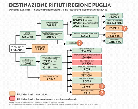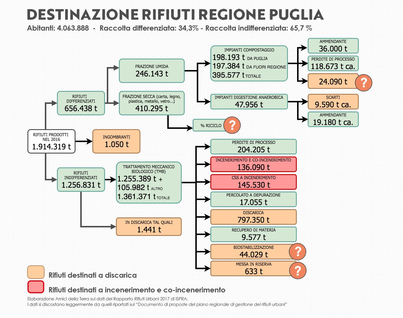 Per parte nostra, abbiamo deciso di collaborare per quanto possibile, partecipando ai confronti pubblici ed analizzando i dati. E’ questo il diagramma che , secondo noi, in base ai dati ISPRA (che si discostano leggermente da quelli utilizzati dal Documento di Piano), illustra i flussi dei rifiuti pugliesi: