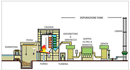 Anche il sistema di trattamento dei fumi si presenta piuttosto articolato, in linea con la tendenza che si va riscontrando a livello nazionale che prevede l’impiego di sistemi di depurazione multistadio per la rimozione delle polveri e dei gas acidi che non danno luogo alla produzione di effluenti liquidi da sottoporre a successivo trattamento.