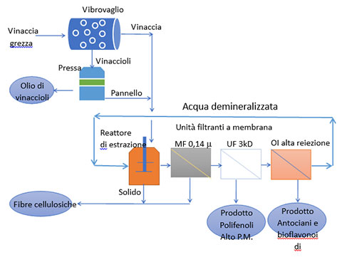 L’estrazione dei principi attivi delle due matrici (vinacce e vinaccioli) prevede un percorso comune basato sull’impiego di filtrazioni tangenziali a membrana (filtri che operano a livello delle dimensioni molecolari dei composti chimici) ma con alcune specificazioni come di seguito nello schema di processo seguente.