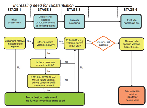In conclusione, quindi, sarebbe stato forse preferibile un approccio più pragmatico, escludendo tutte le aree italiane dove sono presenti vulcani con manifestazioni significative in tempi storici e rimandando alla fase di approfondimento la valutazione, anche in termini di ampiezza, delle altre aree interessate da vulcanesimo più o meno recente. In altre parole, si potrebbero escludere, in prima analisi, le aree interessate da piani di emergenza per il rischio vulcanico e quelle interessate da colate laviche o da flussi piroclastici significativi in tempi storici se non hanno piani di emergenza, per poi seguire, per tutte le aree vulcaniche italiane, l’approccio indicato dalla IAEA, in particolare nella guida IAEA SSG-21 : Volcanic Hazards in Site Evaluation for Nuclear Installations. Specific Safety Guide. Vienna 2012 (tenendo conto che i vulcani “quiescenti” sono in parte assimilabili a quelli capable secondo tale documento IAEA), dove per definire il rischio vulcanico in un sito viene indicato lo schema qui sotto riportato.