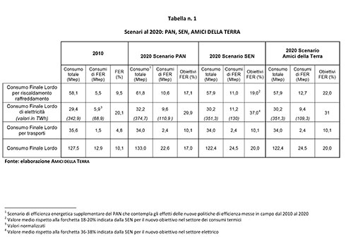 “Per questo – ha concluso Filippini- gli Amici della Terra propongono di modificare gli obiettivi della SEN per le fonti rinnovabili al 2020, portando al 22% l’obiettivo delle rinnovabili termiche (ora indicato al 19%), e riducendo al 31% quello delle rinnovabili elettriche (ora al 37%). In questo modo aumenterebbe la coerenza interna della Strategia e verrebbe dato un chiaro segnale di discontinuità rispetto al precedente ciclo di politiche di incentivazione. Tale scelta consentirebbe comunque di raggiungere l’obiettivo generale del 20% di rinnovabili al 2020 (vedi Tabella n 1), puntando con chiarezza sulle rinnovabili termiche, che sicuramente possono svilupparsi nella misura proposta con minori costi di incentivazione e maggiori ricadute per l’economia italiana rispetto alle rinnovabili elettriche”.