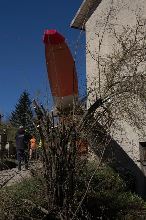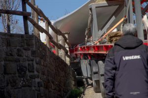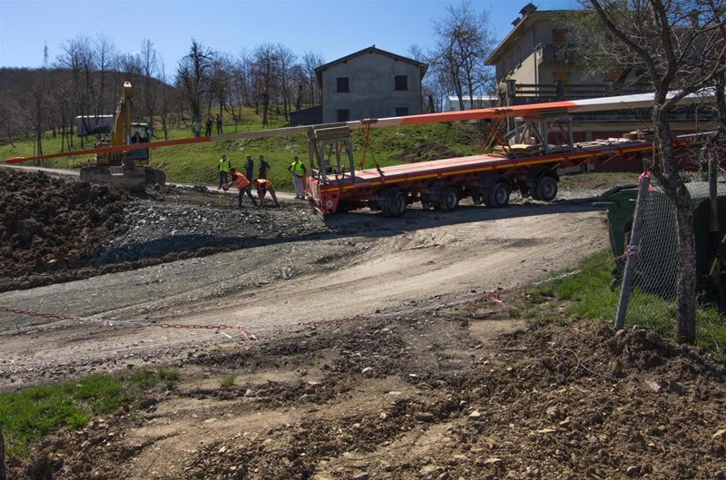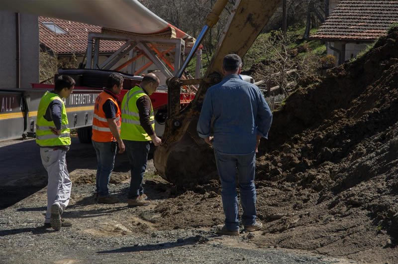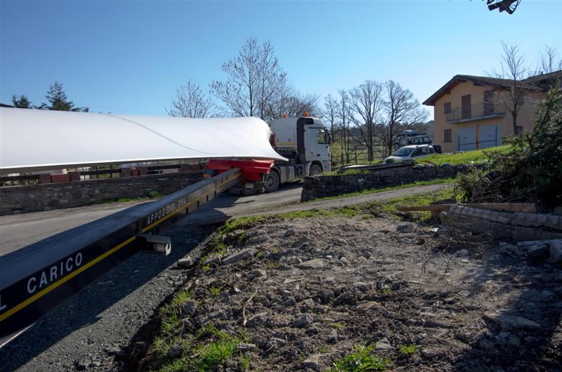 Un bulldozer era già caduto in una scarpata nelle scorse settimane, ma adesso siamo all’assurdo: nessuno aveva pensato all’ingombro volumetrico delle enormi pale che si sarebbero dovute portare in cima alla montagna lungo una affascinante stradina di montagna, ripida, stretta e tortuosa, ai cui lati sorgono innumerevoli casette. I problemi dei trasporti eccezionali sono cominciati già alla prima curva! Ma che strano! Chi lo avrebbe mai detto, conoscendo i luoghi …