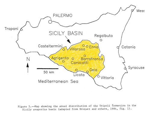 Fig. 2. L’area occupata dalla formazione “Tripoli” nel bacino Siciliano. Da Dyni (1988), modificato.
