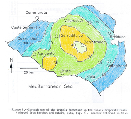 La formazione geologica contenente shale è comunemente denominata “Tripoli” o “Tripolite” ed è costituita da marne diatomitiche di età miocenica (messiniano) spesse al massimo circa 45 metri (non mancano però autori che indicano 90 metri come spessore massimo) e le cui isopache, in via molto preliminare, sono riportate in Fig 3.  Riportiamo di seguito alcuni dati di interesse presi da  uno studio condotto nel lontano 1988 da un geologo del Servizio Geologico degli Stati Uniti (USGS), John R. Dyni (1988), che agiva, tra l’altro, anche su richiesta delle autorità regionali siciliane:  “Review of the geology and shale oil resources of the tripolitic oil-shale deposits of Sicily, Italy. USGS”, Open File Report 88-270”. Questo studio prende in considerazione anche altri significativi studi precedenti.