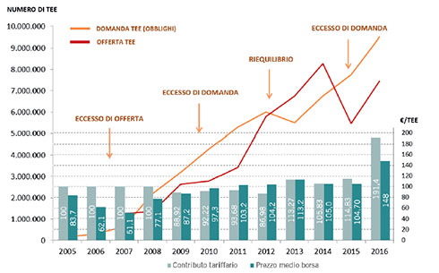 In determinati periodi infatti il prezzo di vendita dei titoli ha raggiunto punte minime di 70 €/TEE, come conseguenza della grande liquidità di titoli associati alle campagne di diffusione delle lampadine ad alta efficienza e ai frangigetto su scala massiva.  Negli anni successivi poi il sistema ha corso il rischio viceversa di andare in crisi di liquidità con crescita esponenziale dei prezzi di scambio sulla piattaforma del GME che hanno raggiunto punte massime di 150 €/TEE. Il Regolatore però, come si vede in figura 1, intervenne puntualmente con azioni correttive sul sistema riportando l’equilibro, senza però alterarne la struttura di base, riuscendo a mantenere relativamente stabile il prezzo a valori mediamente attorno ai 100 €/TEE, e questo con soli tre importanti interventi nel corso di un decennio, anche a fronte di obblighi sempre in aumento.