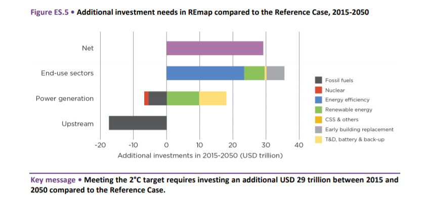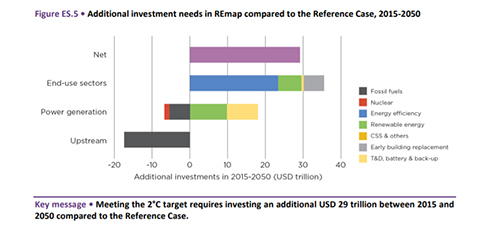 Quanto ai costi, una recente approfondita valutazione condotta congiuntamente da IEA (The International Energy Agency) e IRENA (The International Renewable Energy Agency un’organizzazione intergovernativa che sostiene i paesi partecipanti nella loro transizione verso un futuro energetico sostenibile)- quindi da fonte certo non ostile alla transizione verso una “carbon free society” - quantifica in 29 mila miliardi di dollari i costi aggiuntivi nell’arco di tempo 2015 – 2050 ) cioè, mediamente, quasi mille miliardi di dollari all’anno).