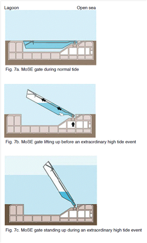 La figura sottostante illustra sinteticamente i principi di funzionamento dell’opera. In occasione di una marea straordinaria le paratie, normalmente posate sul fondo (fig. 7a) vengono svuotate immettendoci dell’aria compressa (frecce nere nella fig. 7b). Questo processo dura circa 30 minuti ( il processo inverso richiede invece circa 15 minuti). Le paratie rimangono alzate, come in fig. 7c, e quindi in posizione di fermare la marea proveniente dall’Adriatico per circa 4-5 ore (la durata della marea). Il funzionamento quindi è principalmente basato sulla spinta di Archimede.