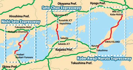 Questi tre complessi di ponti uniscono le zone di Osaka-Kobe, Okayama e Hiroshima rispettivamente al nord-est, centro e sud-ovest Shikoku con l’obiettivo di potenziarne l’industria (compresa la cantieristica), l’agricoltura (subtropicale) e lanciare il turismo. Shikoku è ricca di montagne intatte, con gole spettacolari, ospitalità tradizionale, castelli pre-Meiji, spiagge sul Mare Interno, treni turistici, persino oliveti (decorativi); il triplice sistema di ponti è grandioso.