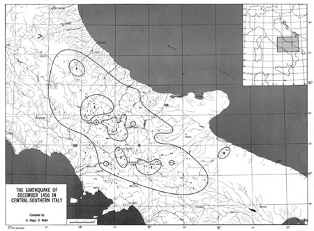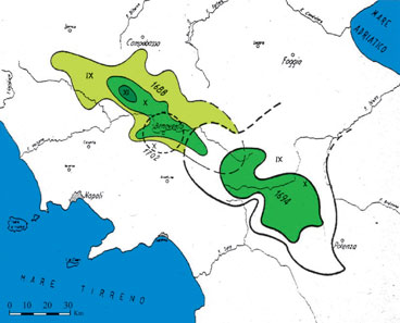 Figura 1 – Campo macrosismico del terremoto del dicembre 1456 in Italia centro-meridionale (da Postpischl, 1985). Il terremoto causò forti danni in Campania, Molise, Basilicata, Abruzzo, Lazio e Puglia.