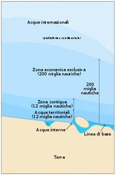 Vi sono poi :una zona di mare "contigua" alle acque territoriali di altre 12 miglia; una zona economica esclusiva fino a 200 miglia; la piattaforma continentale; tutte delimitazioni che si riferiscono a vari diritti che gli stati si riservano su tali acque. Se una nave entra all’’terno di tale limite, può essere fermata e ispezionata dalle unità di polizia marittima.