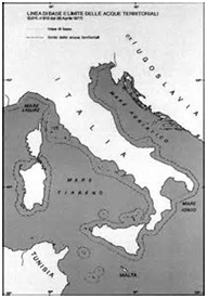 Fino alla Seconda guerra mondiale, le acque territoriali italiane si estendevano per 3 miglia marine a partire dalla linea di bassa marea della costa.