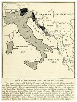 Le promesse all’Italia con il Trattato di Londra: Trentino, Alto Adige, Venezia Giulia con Istria, Isole Carnerine, Isole Dalmate, Dalmazia centrale (con Zara, Sebenico, Traú).