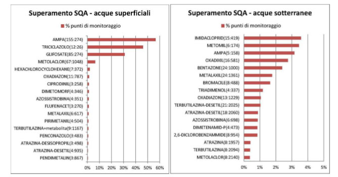 Sostanze più frequentemente rilevate sopra agli SQA, anno 2012 (dal Rapporto nazionale pesticidi nelle acque, Edizione 2014 - ISPRA)