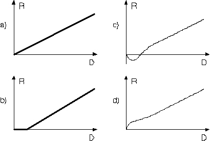 Le diverse alternative sono mostrate nella figura, dove l’asse orizzontale rappresenta la dose D. l’asse verticale la risposta R, cioè la pericolosità, nei seguenti casi: linearità senza soglia (a), linearità con soglia (b), effetti di ormesi (c), effetto sopralineare (d), per cui le piccole dosi risultano più pericolose che nel caso lineare.