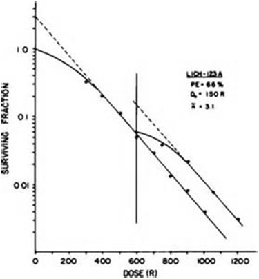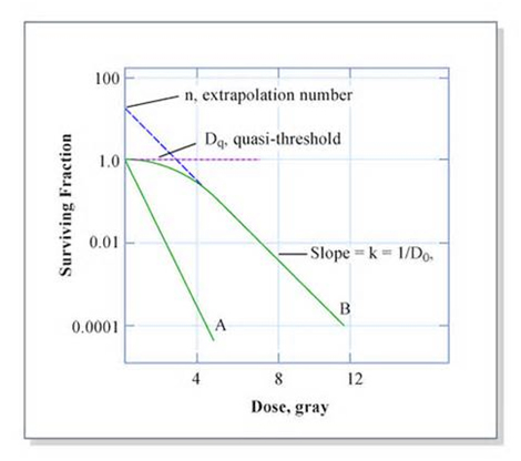 Determinando in questo sistema sperimentale l’andamento di queste curve, Puck e Marcus pubblicarono [9] quella che sarebbe diventata la curva di sopravvivenza ai raggi X di “forma” standard per i mammiferi (e poi anche per altri organismi). Questa curva di sopravvivenza cellulare ai raggi X appare essenzialmente esponenziale tranne la parte iniziale su grafico semilogaritmico (sigmoide su grafico lineare), definita da una pendenza Do sul tratto lineare, un numero di estrapolazione n a D=0 oppure una dose-quasi-soglia Dq a S=1 (dove S è la frazione di cellule sopravviventi). In altre parole, si ha una curva con una “spalla” – si noti bene, non una “soglia” - che precede un tratto esponenziale.