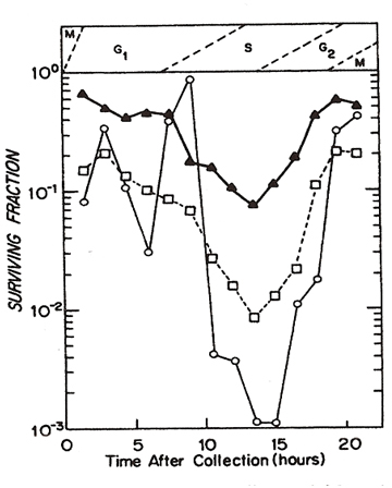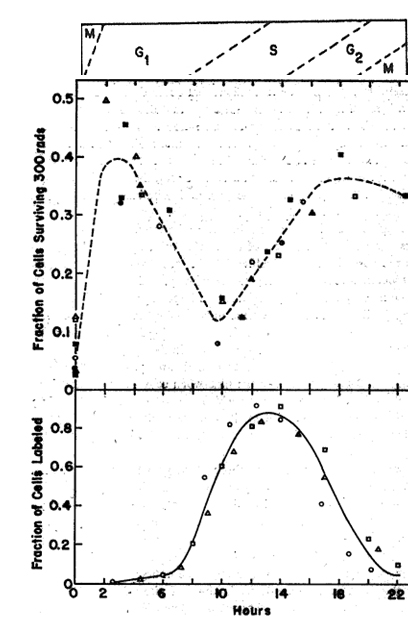 Un ulteriore progresso metodologico permise di descrivere un altro importante fenomeno. L’osservazione di Terasima e Tolmach (1961) [19] che le cellule in fase di mitosi erano meno solidamente adese alla superficie di plastica della piastra rispetto alle cellule in fase G1/S/G2 rese possibile la raccolta di una popolazione cellulare parasincrona (con questo termine si intendono cellule raccolte all’incirca in fase M = mitosi, non esattamente tutte nello stesso momento del ciclo cellulare ma considerabili come quasi sincronizzate) che poteva, una volta riseminata, poi procedere come una coorte per almeno un ciclo cellulare (perdendo gradualmente sincronia per variabilità individuale). Nel riquadro in basso della Figura 7 è indicata, come funzione del tempo dopo la semina delle cellule parasincrone a t = 0 h, l’incorporazione di timidina tritiata (indizio di sintesi del DNA in corso) da cui risulta una fase S approssimativamente tra l’ora 9 e l’ora 18 (della durata quindi di 9 ore); nel riquadro superiore è indicata la frazione di cellule sopravviventi ad un trattamento con 300 rad (circa 3 Gy) per campioni irradiati a diversi tempi della progressione nel ciclo delle cellule parasincrone (i diversi simboli si riferiscono a esperimenti diversi): in tal modo, gli autori hanno potuto dimostrare [19] la grande radiosensibilità delle cellule nella transizione G1/S e nella parte iniziale della fase S, nonchè in M (mitosi), e la relativa radioresistenza delle cellule in fase G1 e G2.