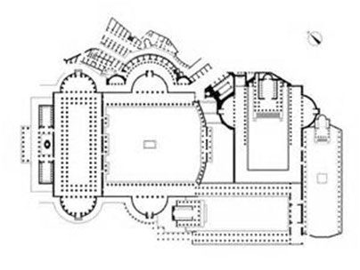 Fig. 1. La mappa schematica mostra parte dei Fori Imperiali in Roma: (da sinistra verso destra) Colonna Traiana con Biblioteca Greca e Biblioteca Latina, Basilica Ulpia, Foro Traiano, Foro di Augusto con Tempio di Marte Ultore, Foro di Nerva con Tempio di Minerva, (in alto) Mercati Traianei con la forma semicircolare che si adatta alla scarpata verso il Quirinale risultata dal taglio della sella tra questo colle e il Campidoglio, (in basso) resti della poco nota struttura semicircolare sull’altro lato del taglio della sella, (in basso verso destra) Foro di Cesare, (più in basso e più a destra non visibile il Foro Romano di epoca repubblicana). La Via dei Fori Imperiali oggi approssimativamente separa il Foro Traiano dal Foro di Cesare e taglia a metà il Foro di Nerva.