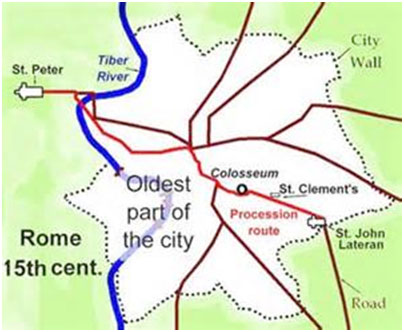 Il problema viario nord-sud si ripropose in termini diversi nelle varie zone della città medievale nel VII-VIII secolo. Questa volta la questione riguardava il papa che aveva sviluppato una doppia residenza: al Laterano come vescovo di Roma e in Vaticano come pontefice, con relativa processione per insediarsi e andare da una sede all’altra.