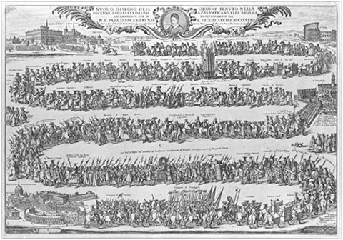 Fig. 3. In questa stampa dei tempi di papa Innocenzo XII (Antonio Pignatelli, 1691-1700) è mostrata la processione come continua lungo la Via Papalis dal Vaticano al Laterano passando per il Campidoglio (a metà sulla destra) e il Colosseo (in alto a destra).