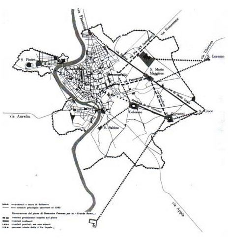 Fig. 4. Schema completo del piano viario sistino. In linea continua le strade realizzate: la Via Felice/Sistina da Trinità dei Monti a Santa Croce in Gerusalemme; lo Stradone di San Giovanni. In linea tratteggiata le strade in corso di realizzazione: Via Merulana; Via Panisperna; e il rifacimento dell’Alta Semita, poi Via Pia, oggi Via del Quirinale e Via XX Settembre. In linea a puntini le strade in progetto: da San Giovanni in Laterano a San Paolo Fuori le Mura; dal Colosseo a Santa Sabina; da San Giovanni in Laterano a Santa Croce in Gerusalemme (poi realizzata, oggi Via Carlo Felice); la strada per San Lorenzo Fuori le Mura (poi realizzata, ma oggi non più esistente); prolungamento da Trinità dei Monti a Piazza del Popolo (improbabile dal punto di vista altimetrico). In linea a puntini radi: dal Colosseo a San Pietro in Vaticano (rifacimento rettilineo della Via Papalis).