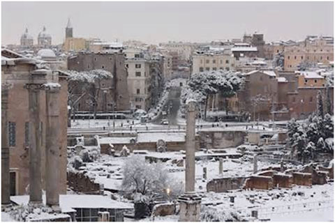 Fig. 6. Via Cavour che sbocca su Via dei Fori Imperiali, vista dal Foro Romano. La nevicata è probabilmente quella del Natale 1939.