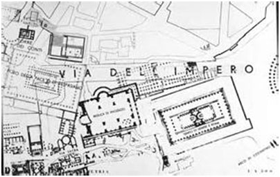 Fig.7. Via dell’Impero e le preesistenze archeologiche nella zona della Velia tra Via Cavour e il Colosseo.
