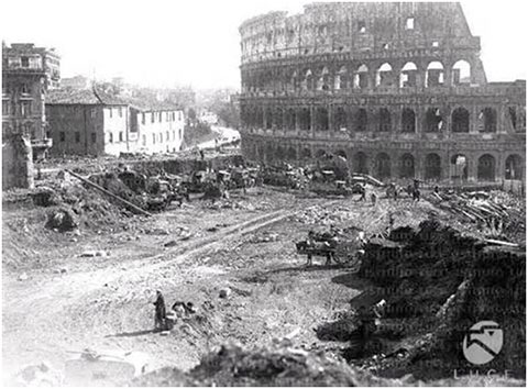La strada di parata fu costruita nel 1926-1932, il Colosseo divenne il fondale di Piazza Venezia, a sua volta divenuta un incrocio, anzi un super-incrocio al centro della città con un bivio: Via del Mare (oggi Via del Teatro Marcello) e Via dei Monti (Via dell’Impero, oggi dei Fori Imperiali) ai due lati del Vittoriano. Il quartiere Alessandrino o dei Pantani fu distrutto, la collina della Velia livellata. Sulla vicenda, sui pareri contrastanti circa gli effetti sull’archeologia e sul traffico, è stato scritto tanto (a partire da Antonio Cederna) che qui non ci interessa salvo che per spiegare la situazione che si era creata.