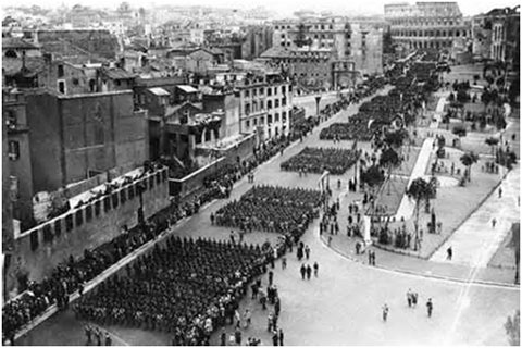 Fig. 9. Una parata in Via dell’Impero in epoca fascista. Alcuni dei palazzi (sulla sinistra) non sono ancora stati demoliti.