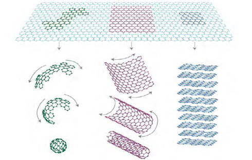 Figura 1: Struttura dei materiali grafitici. Da sinistra a destra, un fullerene, un nanotubo e grafene |