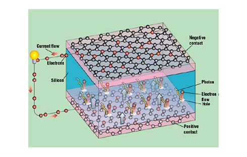 Figura 2: Rappresentazione schematica di una cella solare che consiste di una cella fotovoltaica inserita tra due strati di grafene. La luce attraversa il grafene ed è assorbita dal silicio, i fotoni eccitano gli elettroni del silicio che migrano al contatto negativo di grafene e si muovono attraverso la struttura del grafene verso un circuito esterno che producendo elettricità (Fonte: Treccani) |