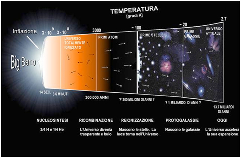 Figura 2. Diagramma spazio-temporale dell’Universo. A sinistra si vede la rapida espansione dello spazio tempo avvenuta dopo il Big Bang, mentre la lieve divergenza a destra dalla struttura conica, indica la fase di accelerazione che l’Universo sta oggi attraversando. Sul lato superiore del cono è riportata la temperature dall’Universo e in basso la sua età. Sotto la figura sono riportati i principali fatti avvenuti dal Big Bang ai nostri giorni.