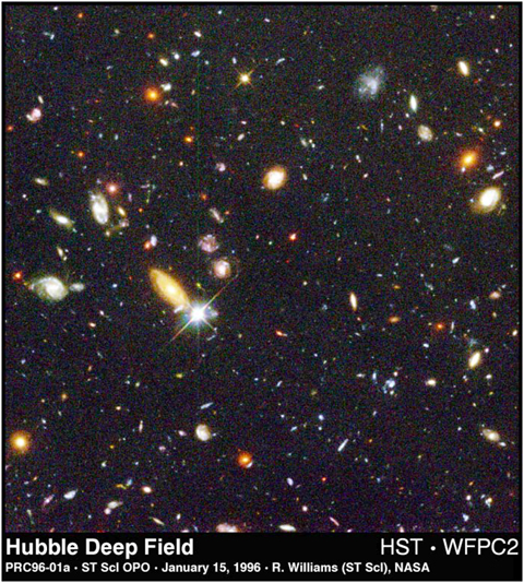 Figura 3. Hubble deep field. Immagine HST (1996) di un quadrato di cielo di lato pari a 1/30 del diametro della luna. E’ l’immagine più profonda che sia mai stata ottenuta dall'uomo, l'oggetto meno luminoso che vi appare è 4 miliardi di volte più debole del limite dell'occhio umano. Quasi tutti i puntini che si vedono sono galassie come la nostra, contenenti miliardi di stelle. Foto HST. Credit: Robert William, the Hubble Deep Field Team and NASA.