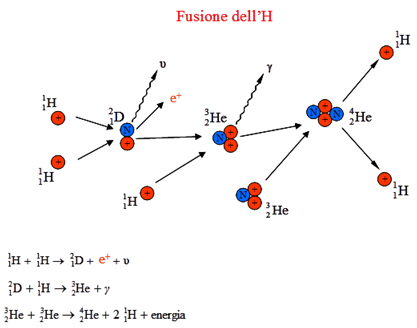 Figura 4: Il ciclo protone-protone con cui 4 nuclei di Idrogeno (11H) si trasformano in un atomo di 4He, passando attraverso due elementi intermedi 21D ed 32He. I tondi blu con N indicano i neutroni che non hanno carica elettrica. Quelli rossi con un + sono i protoni (nuclei dell’atomo d’Idrogeno) che hanno un massa quasi identica a quella dei neutroni, ma carica positiva; e+ sono i positroni, particelle di massauguale a quella degli elettroni ma con carica positiva. Il numero in alto a sinistra, accanto al simbolo dell’atomo, è il peso atomico, ossia il numero di neutroni e protoni di cui l’atomo è costituito; quello in basso a sinistra è il numero atomico, ovvero il numero di protoni contenuti nel nucleo corrispondente alla carica elettrica del nucleo e al numero di elettroni (e-) che l’atomo deve avere per essere neutro.