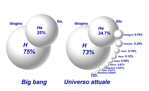 Figura 5: Le abbondanze relative degli elementi, espresse in massa: come erano dopo il big Bang (Idrogeno per 3/4 ed Elio per 1/4) e come sono ora. La massa totale degli elementi più pesanti dell’Elio costituisce oggi il 2.3% della massa dell’universo. Nella figura i volumi sono proporzionali alle masse relative.