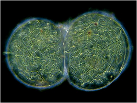 Figura 6: Un batterio procariote in riproduzione: nelle due cellule figlie è visibile il DNA.