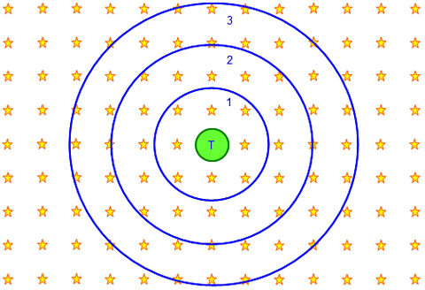 Si può capire il ragionamento di Keplero e di Olbers guardando la Figura 7. In un cielo riempito di stelle in modo uniforme è posta la Terra (indicata con T), attorno alla quale è disegnata una serie di sfere concentriche. Se dalla Terra guardiamo in una certa direzione e in quella direzione c’è una stella, da quella direzione verrà luce e il cielo in quel punto non sarà più scuro. Guardando la Figura si intuisce che, se consideriamo solo le stelle contenute nella sfera 1, la probabilità d’incontrare una stella è bassa, ma se consideriamo anche quelle della sfera 2, la probabilità aumenta e così via all’aumentare del numero delle sfere prese in considerazione. Per chi ricorda un po’ di algebra e di fisica, nella didascalia della Figura 5 è data una dimostrazione un po’ più quantitativa.