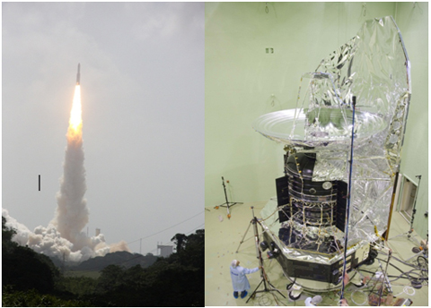Figura 8: Il satellite Herschel, costruito dall’Agenzia Spaziale Europea (a sinistra nella fase di assemblaggio), lanciato il 14 maggio 2009 da un Ariane V da Kourou nella Guaiana Francese (l’immagine del lancio ). Il satellite ha tra i suoi obiettivi trovare e studiare le galassie più lontane, quelle previste da Olbers che emettono nell’infrarosso. A bordo c’è il più grande telescopio spaziale mai costruito.