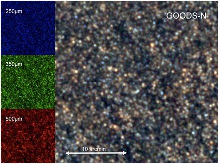 Figura 9: Immagine nel lontano infrarosso ottenuta dal satellite Herschel di una zona di cielo scelta per essere quasi vuota nelle misure nel visibile. Gli oggetti che si vedono sono tutte galassie che emettono nell’infrarosso. La loro densità è ancora più alta di quella che si vede in figura, perché quelle non risolte spazialmente, sono state assimilate al fondo ed eliminate nell’analisi dati. Si consideri che l’immagine è più piccola di quella della luna (circa 30 arcmin).