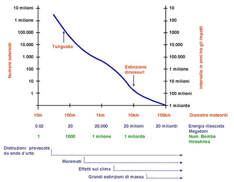 Sotto l’asse orizzontale, è riportata in Megatoni l’energia rilasciata nell’impatto. La scala è indicativa perché l’energia rilasciata dipende dal quadrato della velocità e dalla massa dell’asteroide; abbiamo visto che due asteroidi di diametri simili possono avere masse molto diverse se uno è costituito da polvere e ghiaccio e l’altro di ferro (quello di Tonguska è del primo tipo, quello del Barringer Crater del secondo).