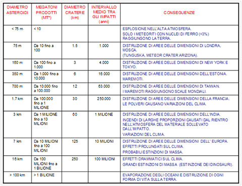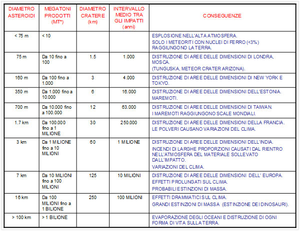 Sotto la scala orizzontale della figura 3 e in maggior dettaglio in tabella 1 sono riportati i danni che possono essere causati da un asteroide.