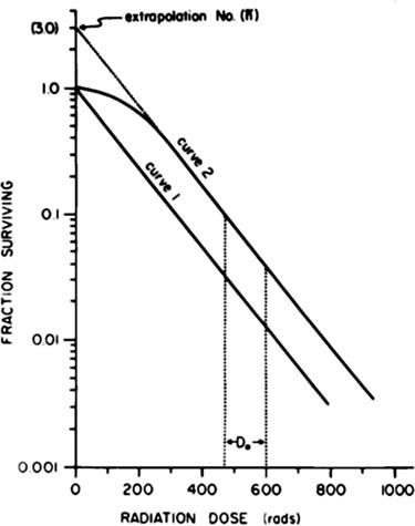 Due curve (con spalla e senza spalla) dose-effetto su grafico semilogaritmico: la frazione sopravvivente (che non subisce effetto) è indicata nell’ordinata su scala semilogaritmica. La curva è una tipica curva di sopravvivenza cellulare alle radiazioni ionizzanti. Qualora non si forzi la curva a passare per i punti dose = 0 e effetto = 1, la “spalla” diviene una “soglia”.