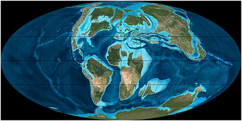 I continenti, in prima approssimazione, apparivano come in Figura 1: l’India era un’isola, l’Himalaya non esisteva così come il Mediterraneo. Per l’alto livello dei mari, l’Europa, l’Africa e l’America del nord erano degli arcipelaghi (situazione che si ripeterebbe oggi se i ghiacci polari dovessero sciogliersi).