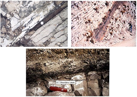 Figura 2: In corrispondenza all’epoca dell’estinzione dei dinosauri si è trovato, nelle rocce di tutti i continenti, uno strato chiamato “KT boundary layer” al di sopra del quale non ci sono resti di dinosauro. In alto, a sinistra, lo strato come si presenta in Italia vicino a Gubbio, a destra a Ramonal nello stato del Quintana (Messico) e sotto, a Carvaca in Spagna. Lo strato ha uno spessore di alcuni centimetri in Italia e Spagna, più di un metro in Messico, indicando così che l’evento che ha causato l’estinzione dei dinosauri deve essere avvenuto in quella zona. © in alto Museum of Natural History Berlin ; sotto © USGS