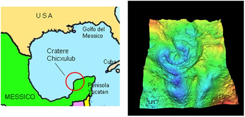 Figura 3: In alto a sinistra, il punto dell’impatto dell’ asteroide che ha causato l’estinzione dei dinosauri. A destra, l’immagine del cratere di 180 km di diametro come si presenta oggi con forti segni di erosione. (© LPI)