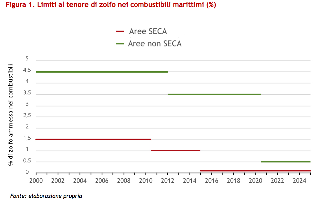 Come è possibile vedere dalla Figura 2, le emissioni inquinanti provocate dai combustibili petroliferi utilizzati nella navigazione, venduti in Italia, sono significative, in particolare quelle di ossidi di zolfo. Comparando queste con le emissioni del trasporto pesante stradale risulta che rispetto alle quantità di prodotti petroliferi o alle unità di energia consumata, le emissioni inquinanti del trasporto marittimo sono mediamente tre volte maggiori nel caso degli ossidi di azoto (NOx), 10 volte nel caso del particolato (PM) e 3,000 volte nel caso degli ossidi di zolfo (SOx).