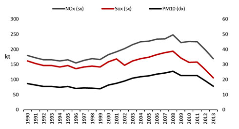 Figura 2. Italia, emissioni di inquinanti in atmosfera da navigazione 1990-2013 (kt)