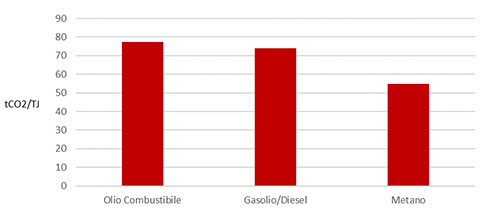 Nella Figura 3 si vedono i fattori di emissione di CO2 connessi alla combustione dell’olio combustibile, del gasolio, del gas naturale, espressi in termini di tonnellate di CO2 emesse per TJ di contenuto energetico dei diversi combustibili considerati.