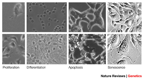 Cellule di mammifero coltivate in vitro: il destino delle cellule (da sinistra a destra): proliferazione, differenziamento, apoptosi (morte cellulare programmata), invecchiamento.