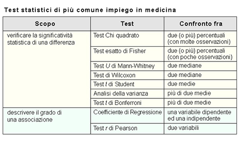 Quando si effettua un test di significatività statistica, inizialmente si assume la cosiddetta “ipotesi zero” (o “ipotesi nulla”), secondo la quale non esiste nessuna differenza tra gruppi riguardo al parametro considerato: i gruppi sono fra loro uguali e la differenza osservata va attribuita al caso. Se un apposito test “consiglia” di rifiutare l'ipotesi zero, allora la differenza osservata risulta statisticamente significativa. I risultati di un test statistico non hanno un valore di assoluta e matematica certezza, ma soltanto di probabilità. La misura del rischio di cadere in errore, ossia che non vi sia differenza tra i gruppi, si chiama livello di significatività del test. Il livello di significatività di una prova può essere scelto a piacere dallo sperimentatore ma, di solito, si sceglie un livello di probabilità (P) di 0.05 (5%) o di 0.01 (1%). Notare che P è una probabilità e quindi può assumere solo valori compresi fra 0 e 1. Un valore P che si avvicina a 0 testimonia una bassa probabilità che la differenza osservata possa essere ascritta al caso. Il livello di significatività 5% viene adottato molto frequentemente in quanto si ritiene che il rapporto 1/20 (cioè 0.05) sia sufficientemente piccolo da poter concludere che sia “piuttosto improbabile” che la differenza osservata sia dovuta al semplice caso. In effetti, la differenza potrebbe essere dovuta al caso, e lo sarà 1 volta su 20, ma tale evento è “improbabile”. Ovviamente, se si vuole escludere con maggiore probabilità l'effetto del caso, si adotterà un livello di significatività inferiore (es. 1%). Peraltro, “statisticamente significativo” non vuol dire importante o rilevante, ma “difficilmente dovuto al caso”. I test statistici utilizzati in medicina sono indicati nella tabella qui sotto riportata (ripresa a E. Bottarelli)